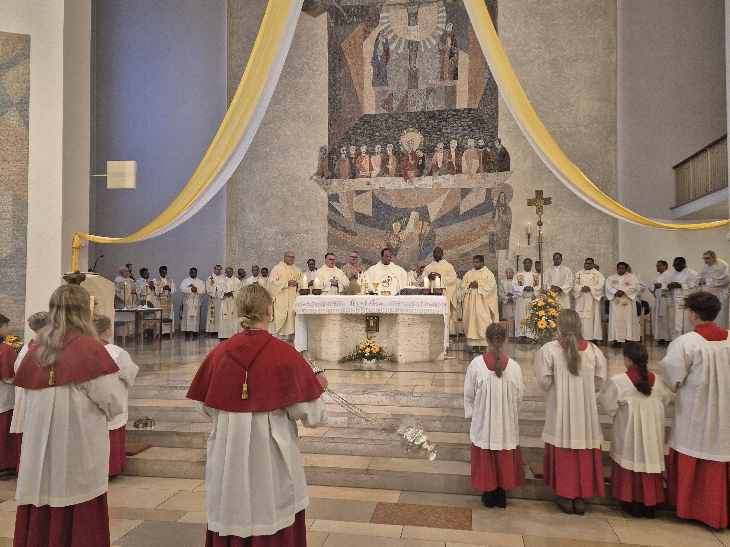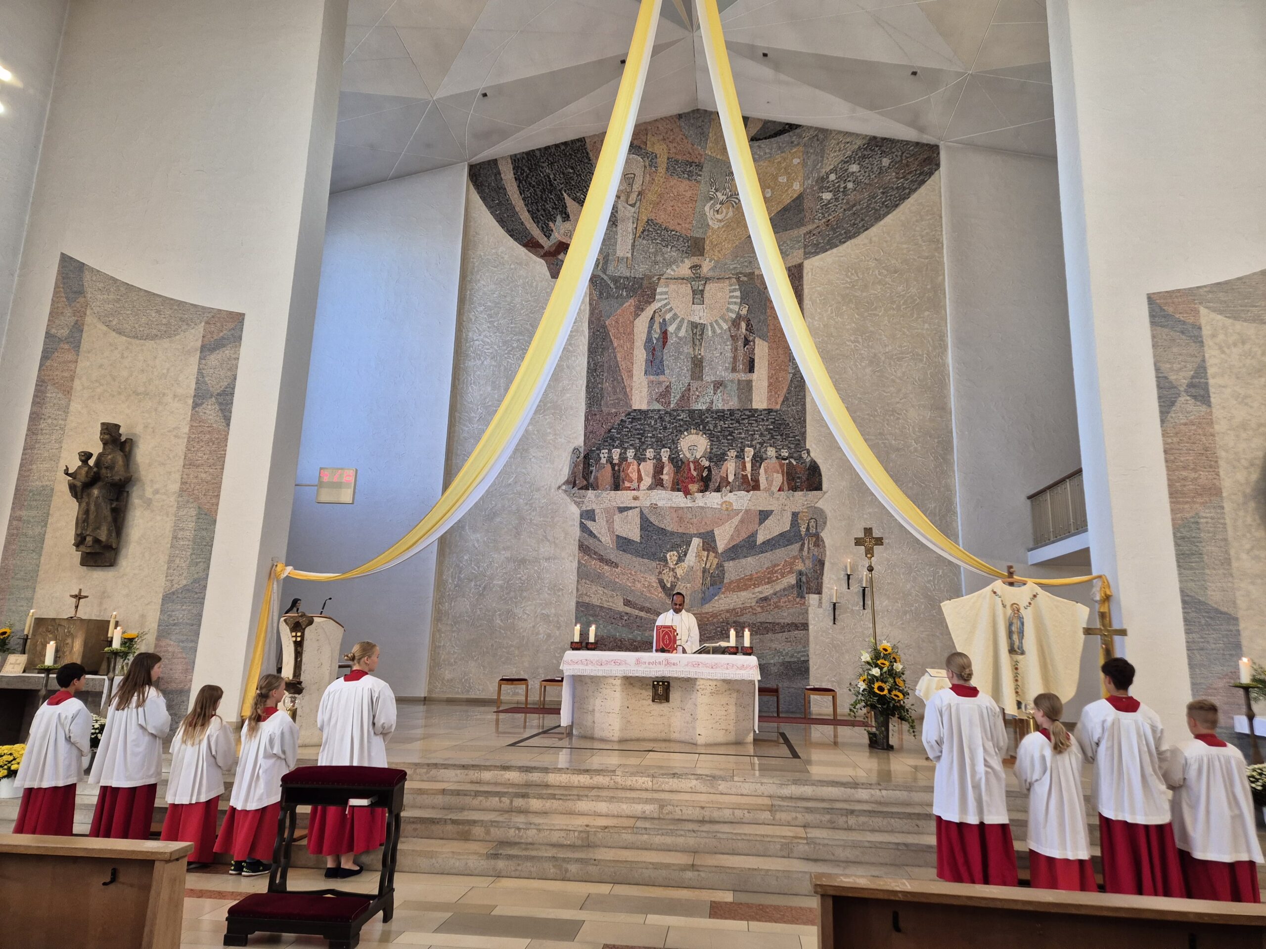 Eine volle Kirche und strahlende Gesichter konnte man am Samstag, 20.07 in der Pfarrkirche St. Josef schon vor Beginn der Messe sehen. Grund war der Afrikanische Gottesdienst im Zaireritus, der von einem kongolesischen Chor aus München mitgestaltet wurde. Die afrikanische Freude, die durch die Gesänge und Rhythmen zum Ausdruck kam, steckte die versammelte Gemeinde an. Besondere Highlights des Gottesdienstes waren u.A. das Gloria, bei welchem der gesamte liturgische Dienst mit Gesang und in rhythmischen Bewegungen den Alter verehrte. Die Predigt von Pfarrvikar Jean-Luc war zu diesem Anlass auf Deutsch und in seiner Muttersprache Lingala. Nach dem Gottesdienst versammelten sich 140 hungrige Gäste, um die Getränke und Speisen aus Indien, Brasilien und dem Kongo, welche von fleißigen Helfern in den Tagen vor dem Fest zubereitet wurden, vollständig zu genießen.